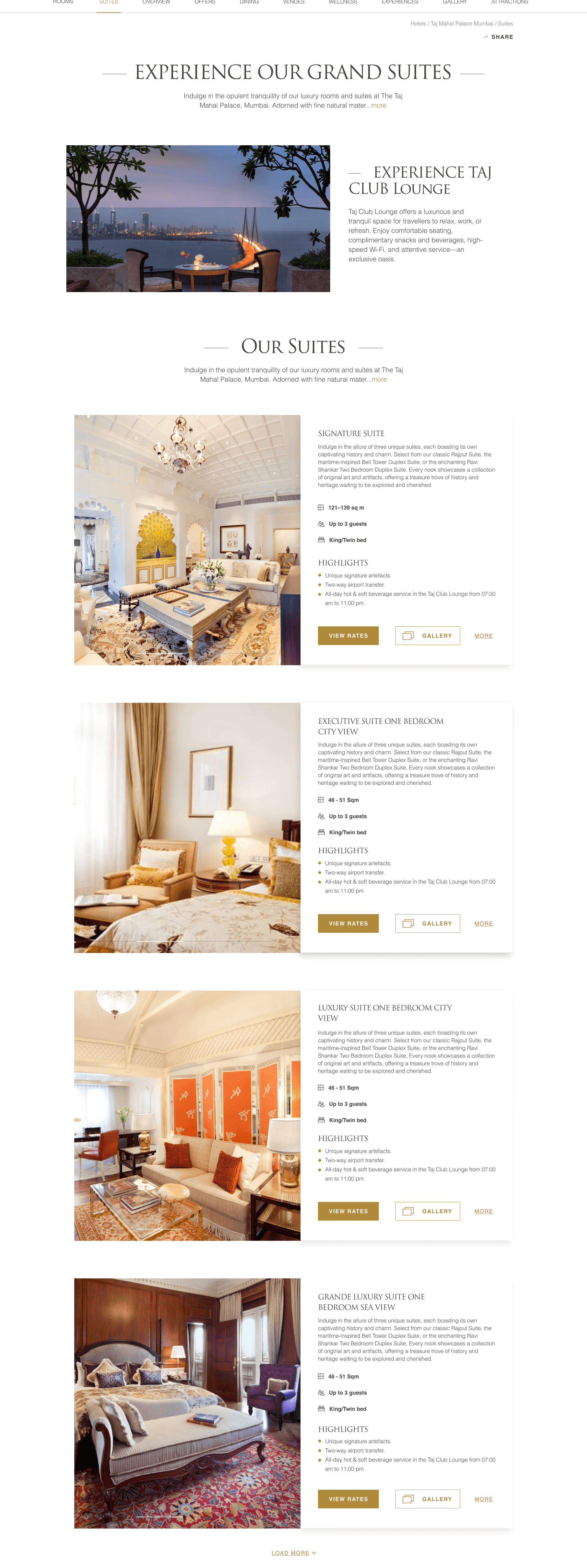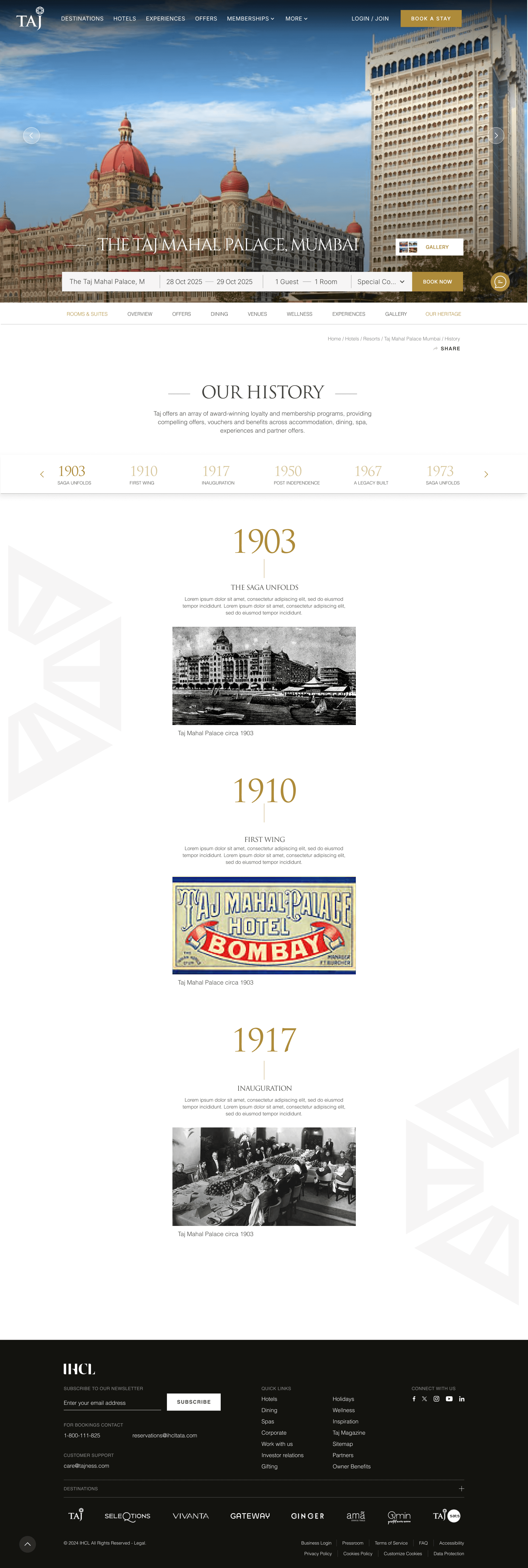 Key pages include Intermediaries, History, and Suite pages for properties such as the Taj Mahal Palace. Each page is crafted to balance rich visual narratives with intuitive navigation, ensuring a seamless and engaging user journey.